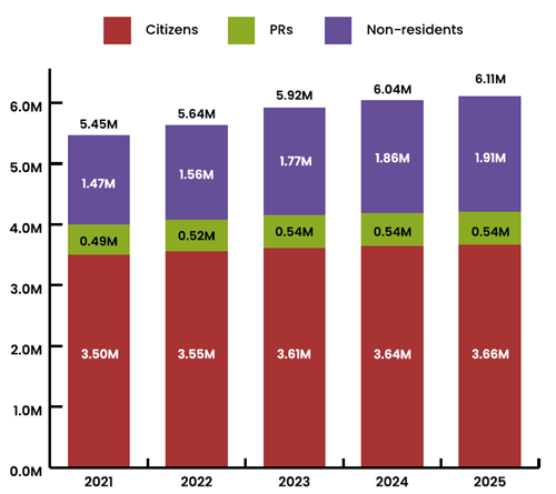 Singapore’s total population stood at 6.11 million as at June 2025 (Diagram 1), a 1.2% increase from June 2024. This increase was mainly due to the growth in the non-resident population. The annualised population growth rate of 1.5% over the past five years (2020-2025) was higher than the 0.5% over the preceding five-year period (2015-2020), mostly due to an increase in the number of Work Permit Holders in the Construction sector to support key infrastructure projects such as Changi Terminal 5 and the ramping up of housing supply.