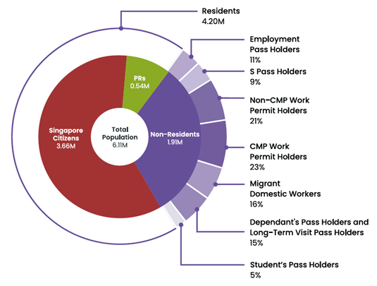 The Non-Resident (NR) population is diverse, and its size and composition fluctuate depending on our economic and social needs. Today, the foreign workforce makes up about two-thirds of the NR population, while the remaining one-third comprises mainly Migrant Domestic Workers (MDWs), dependants, and students.