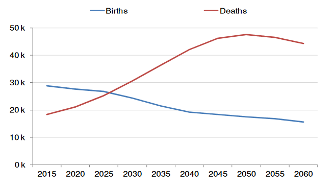Without immigration, and if our current low TFR and high life expectancy continue, the number of citizen deaths is projected to outstrip births by around 2025 (See Chart 4). At that point, our citizen population will start to decline (See Scenario B in Chart 5).