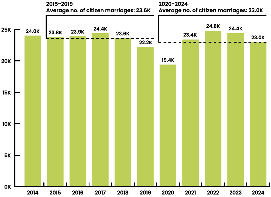 There were 22,955 citizen marriages in 2024, 5.7% lower than the 24,355 citizen marriages in 2023, but higher than the 22,165 citizen marriages in 2019 (pre-COVID) (Chart 3)[1].