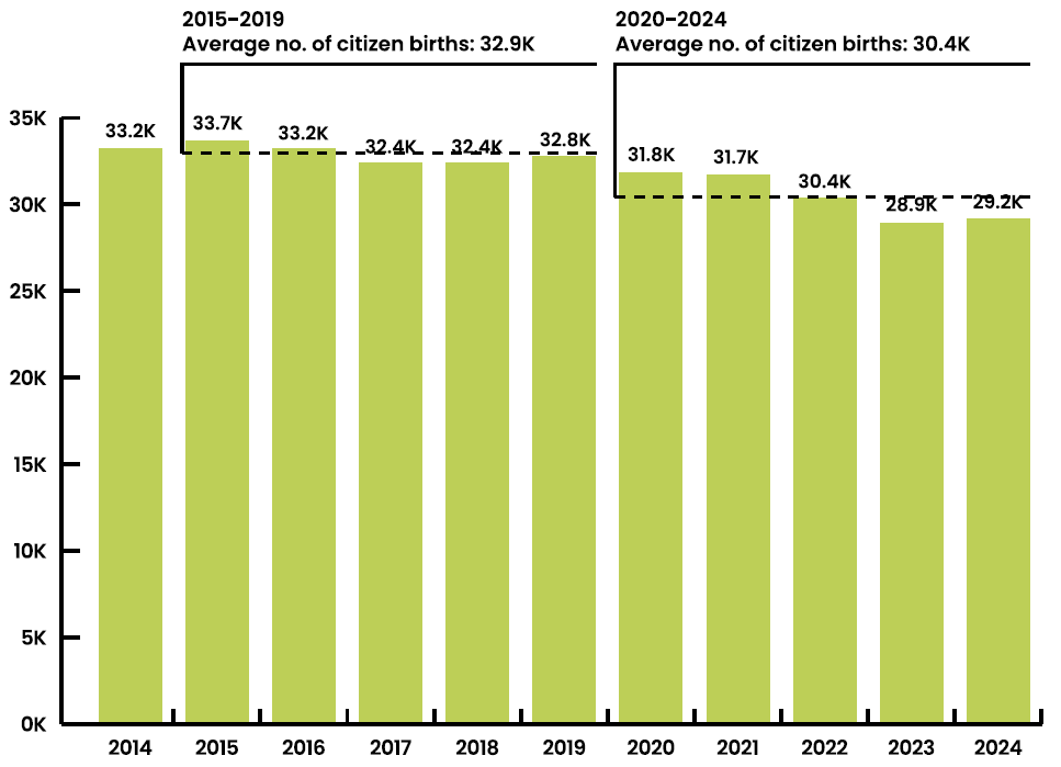 There were 29,237 citizen births in 2024, 1.2% more than the 28,877 citizen