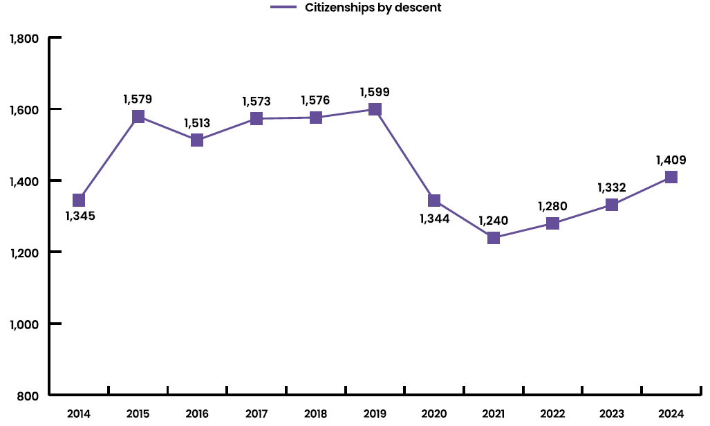 In addition to citizen births in Singapore, there are also children born overseas to at least one Singaporean parents. In 2024, 1,409 children born overseas to at least one Singaporean parents were granted citizenship by descent (Chart 5)[4].